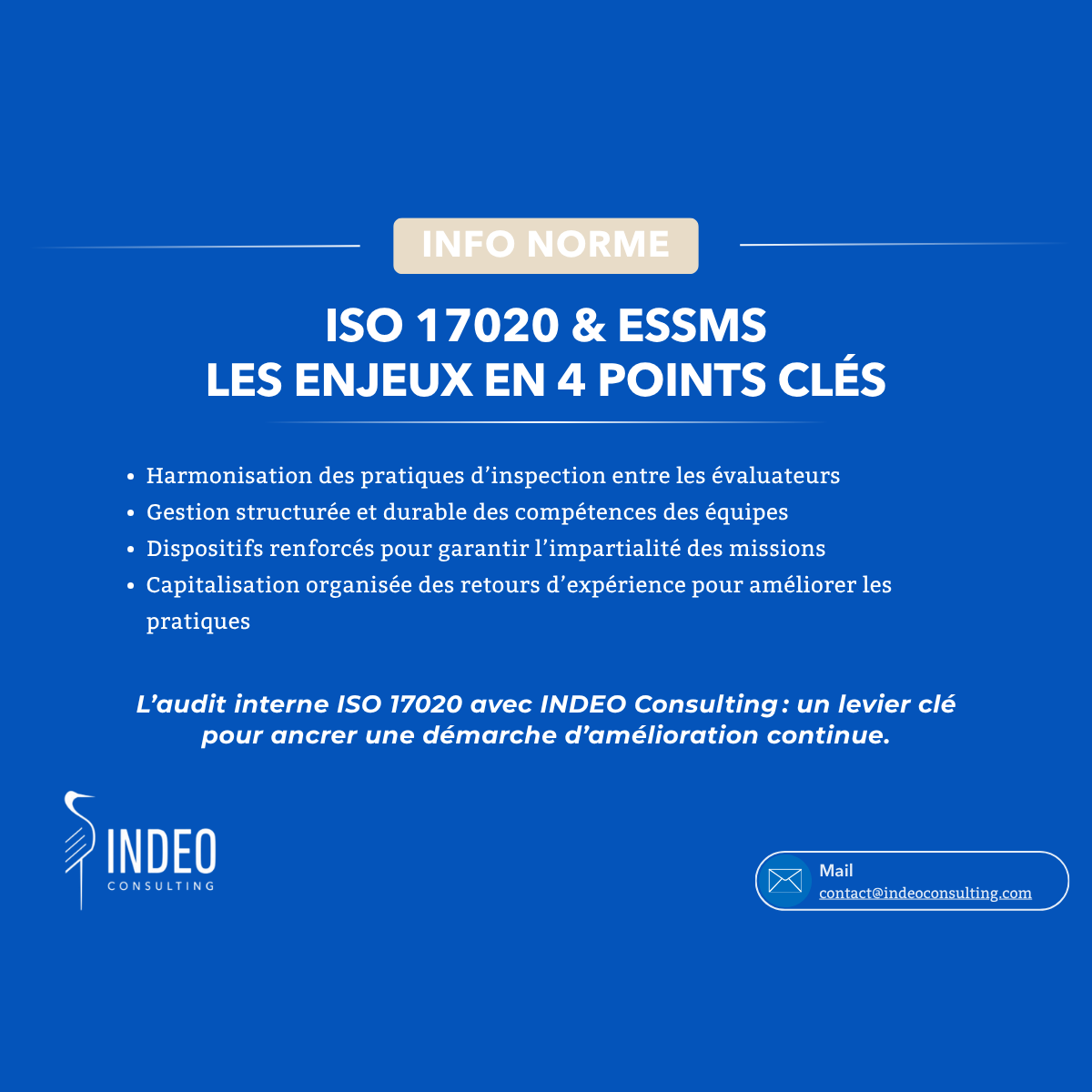 C’est précisément dans cette logique que s’inscrit l’accompagnement proposé par INDEO Consulting. Le cabinet intervient auprès des organismes d’inspection accrédités pour conduire des audits internes approfondis et identifier les leviers d’amélioration du système. Nous attachons une importance particulière à faire évoluer la niveau de maturité de votre système à votre rythme.